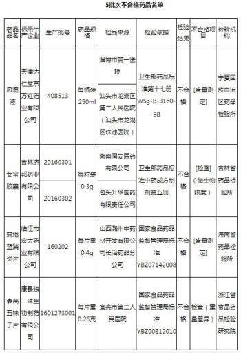 一、不合格产品的标示生产企业、药品品名和生产批号为:天津达仁堂京万红药业有限公司生产的批号为408513的风湿液,吉林济邦药业有限公司生产的批号为20160301和20160302的女宝胶囊,临江市宏大药业有限公司生产的批号为160202的蒲地蓝消炎片,康县独一味生物制药有限公司生产的批号为1601273001的参芪五味子片。不合格项目有含量测定、微生物限度、重量差异、(详见附件)。