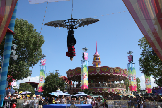 国庆节期间,阿根廷著名魔术师Diego在上海欢乐谷高空舞台,为游客呈现扣人心弦的高空逃脱魔术《魔幻大师》。只见Diego被绑住双手双脚,束缚在兽夹中,倒吊在离地面5米的高空。就在兽夹绳索即将烧断之前,Diego突然从空中跳下,成功脱身,上演现场版的“惊天大逃亡”。现场掌声雷动,惊呼连连。