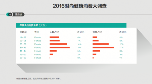跑步、游泳、器械、瑜伽……近年来,一股健身热潮席卷了都市白领一族。其中,跑步无疑是最受欢迎的运动项目。《调查》显示,在“跑友”们对跑步装备的投入中,跑鞋和跑步机最受人钟爱。《调查》同时发现,在很多健身运动爱好者服用的蛋白粉上,女性购买者主要集中在26岁-35岁这一年龄区间,而男性购买者则集中在18岁-35岁区间段。