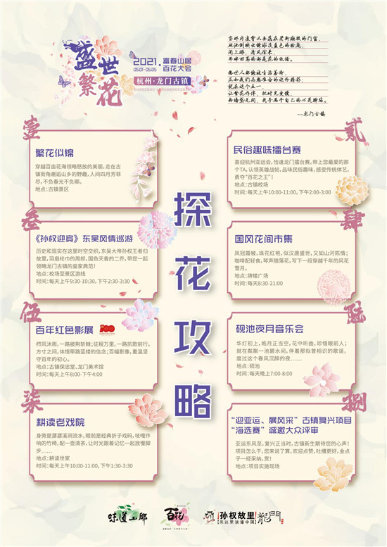 千年烟火未歇,溪畔堂前,又一载繁花落人间。百年山河无恙,静好岁月,君可见盛世如人愿!正值春意盎然的人间四月天,恰逢建党百年。2021富春山居•乡村百花大会以“盛世繁花”为主题,向世人发出诚挚邀约——“五一”期间亲临龙门古镇,看百花盛开、享繁华盛世。今年的百花大会活动将于2021年4月30日开幕,时间持续至5月5日。