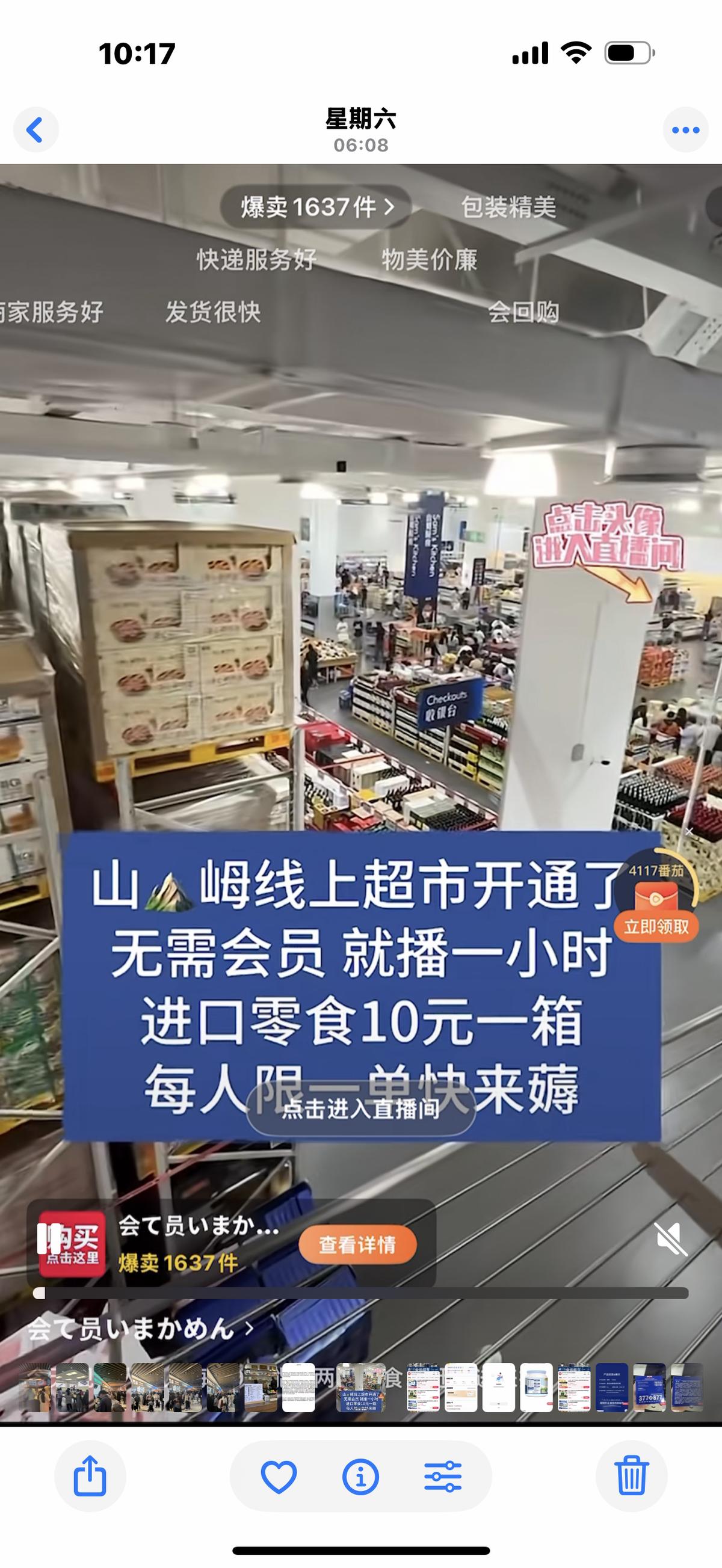 1月3日,记者在网络平台刷到了一则插播视频,视频页面展示了一处大型商场场景,整体布局与陈设风格酷似山姆会员商店。视频页面标称“山㟂线上超市开通了,无需会员,就播一小时,进口零食10元一箱,每人限一单快来薅”。记者注意到,视频中“山㟂”二字中间嵌入了一个山形小图案。该视频账号名为“会て员いかまめん的橱窗”,LOGO是红底圆圈,圈内文字标称“购买点击这里”。记者在该账号的另一则引流视频中看到,视频背景也是酷似山姆会员商店的大型超市,视频页面标称“山姆因特殊原因退出万达,进口零食统统2元起,赶紧进来抢”,账号下方备注“明天清场,进口零食全部不要了,9.9元两箱”。