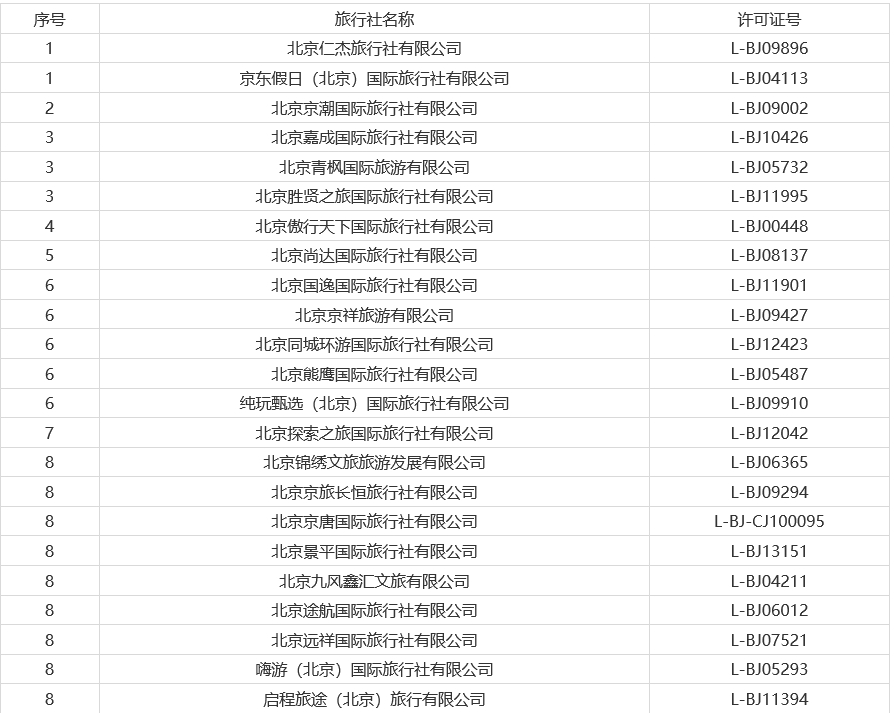北京市文化和旅游局表示,本期上榜旅行社,除北京嘉成国际旅行社有限公司、北京国逸国际旅行社有限公司、北京同城环游国际旅行社有限公司、北京京旅长恒旅行社有限公司、北京景平国际旅行社有限公司、嗨游(北京)国际旅行社有限公司以外,其余旅行社均因存在违法违规问题或者投诉较多,已被暂停北京市旅游团队电子行程单系统备案权限,目前暂不具备组织安排团队游客实际出游的相关资格,应谨慎报名参团旅游。