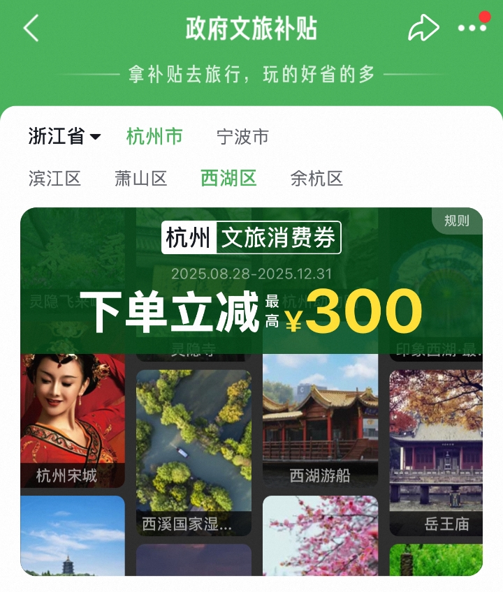 伴随着文旅产品的推出,消费券自然少不了,而且惠民力度空前。杭州在12月底之前将发放4000余万元文旅消费券,其中2000余万元将在“十一”黄金周期间发放,市民、游客可以在飞猪、携程、美团等平台,搜索“杭州文旅消费券”或“杭州文旅券”等关键词,就可以找到活动专区。此外,9月30日上午10时还将在支付宝平台发放体育专项消费券,不管是买运动装备还是预约体育场馆,假期里都能用。