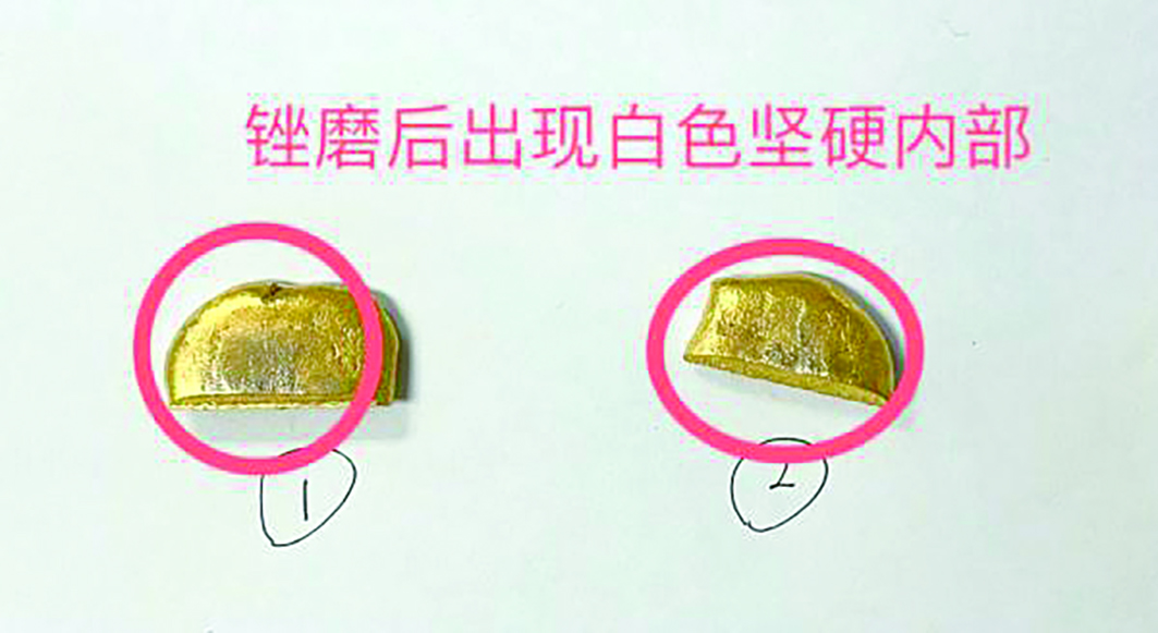 “铼”黄金锉磨后会出现白色坚硬内部