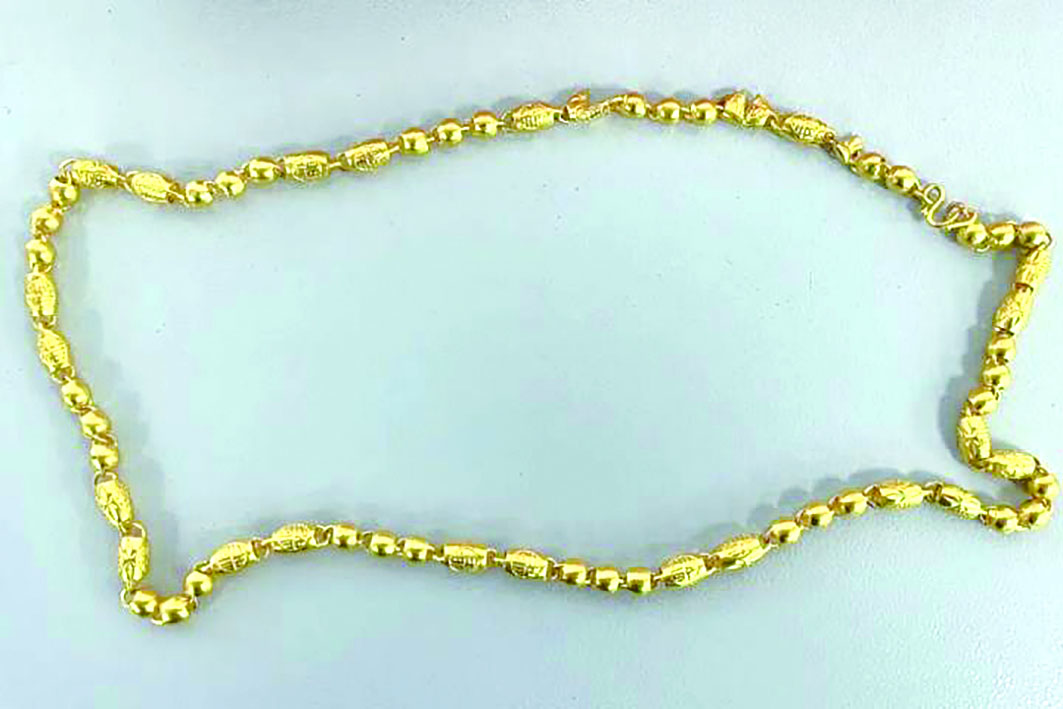 今年8月底,雉城派出所接到辖区一家金店报警,负责人称他们按755元/克市价回收了一条“千足金”项链,总计80克。起初检查一切正常,后续检测却发现这条项链“肚里藏奸”,内部被掺入了大量不明金属,“根本不是足金”。通过第三方专业机构以高温熔炼方式检测,发现所谓足金只有72.9%黄金。