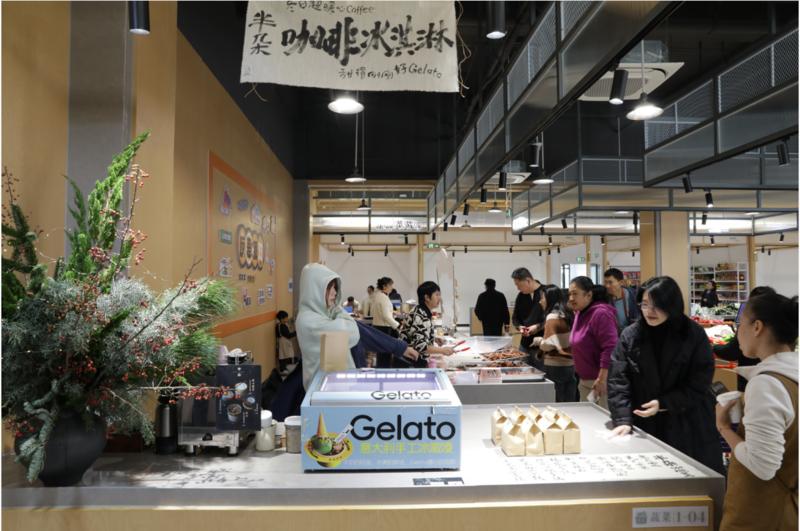 除了装修风格耳目一新,走进这里,更像是体验一场颇具新鲜感的“市井漫游”。菜市有近百家商户,在果蔬、生鲜、坚果零食等常见的摊位之外,游埠鸡子馃、贵阳糯米饭、意式冰淇淋……不少特色小吃都能找到。
