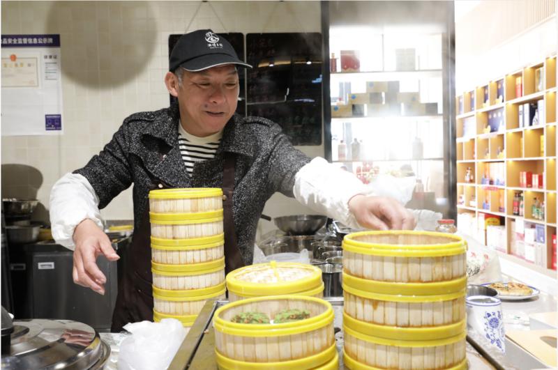 不到10点,95后摊主赵唯宏的摊位前已经大排“长龙”。此前,他因为“美院研究生摆摊卖包子”的话题引发关注,又用山东大蒸包的新奇口感征服了一众杭州市民。双浦菜市开业后,他作为常驻商家正式入驻,开业第一天,不少人慕名前来。