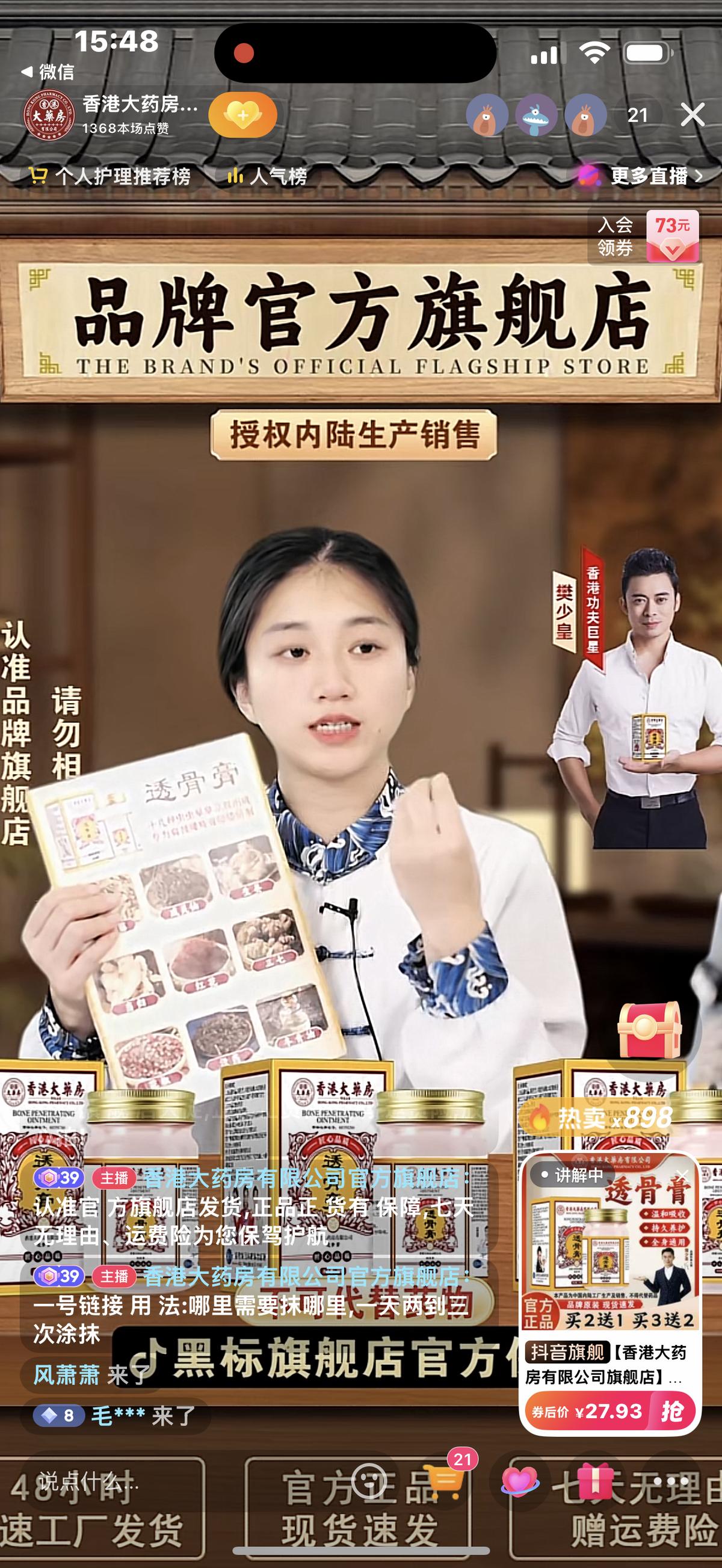 集美区市场监管局调查发现,厦门进港网络科技有限公司开设的香港大药房有限公司官方旗舰店主要经营方式为直播经营,并附产品购买链接,非直播期间消费者可通过网店的产品链接购买。当事人在短视频平台直播间的销售页面标有“始于1841年”“港货正品官方旗舰店”字样。直播间主播介绍香港大药房透骨膏时,宣称“这款透骨膏是香港老品牌,世界冠军都在用”“透皮吸收,透到骨子里帮助到您,不要错过”“肩周周膝盖盖,不灵活不给力我们都可以用,用过的人没有说他不好的”等。