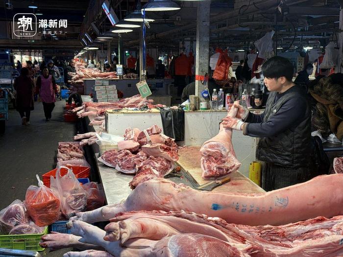 记者先走进一楼猪肉交易区,发现这里的价格相对平稳,并未出现大幅波动。档口老板高师傅一边整理刚到的猪肉,一边向记者介绍:“今天凌晨的批发价是8元/斤,价格比较平稳,但比去年同期贵了1元钱。”