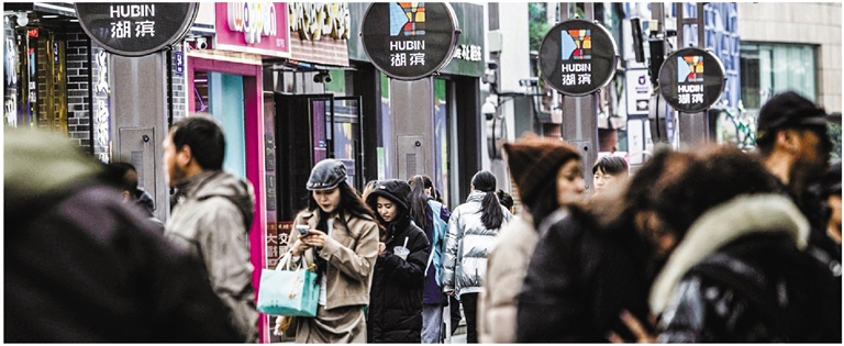 湖滨路步行街人流如织,老字号与潮流品牌比邻而居,传统街巷与现代消费场景交融。