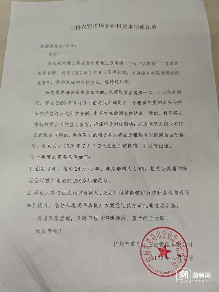 4月11日,苇草启山公司给陈国君发来一份“三桥农贸市场商铺租赁事项通知单”,要求他在6月6日前确定是否续租,如逾期未续租,公司将在7月7日收回商铺。