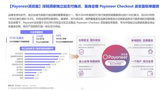 Payoneer Checkout 派安盈收单服务以 “合规安全,提升转化” “本地团队,优质服务” “省心出海,快捷高效” “一个账户,收付全球” 四大优势,紧紧抓住独立站商户的需求痛点,为其出海之路打通了关键节点。
