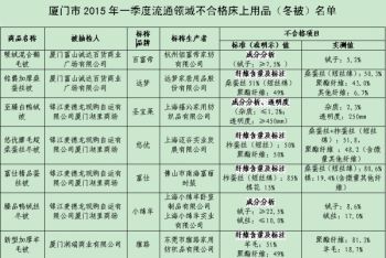 中国消费者报福州讯(记者 张文章) 4月29日,中国消费者报记者从福建省厦门市工商局获悉,根据近年来消费者的投诉举报热点和季节特点,该局今年第一季度对流通领域床上用品(冬被)进行了质量抽查检验,共抽检21个品牌25批次商品,其中蚕丝被17批次、鸭(鹅)绒被6批次、羊毛被2批次,抽检总体合格率为56%。其中11批次冬被检测不合格,涉及百富帝、远梦等标称品牌。