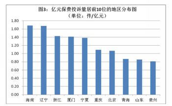 (二)亿元保费投诉量居前10位地区。从各地区单位保费的投诉件数分析,全国亿元保费投诉量平均值为0.65件/亿元,亿元保费投诉量居前10位的地区依次为:海南(1.68件/亿元)、辽宁(1.67件/亿元)、浙江(1.43件/亿元)、厦门(1.41件/亿元)、宁夏(1.38件/亿元)、重庆(1.09件/亿元)、北京(1.07件/亿元)、青海(0.87件/亿元)、山东(0.86件/亿元)和贵州(0.81件/亿元)。