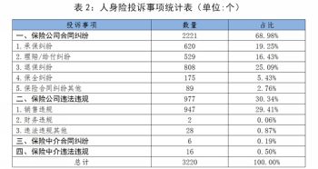 (二)人身险。消费者投诉事项涉及人身险的共有3220个。其中,保险公司合同纠纷类投诉2221个,涉嫌违法违规类投诉977个;保险中介合同纠纷类投诉6个,涉嫌违法违规类投诉16个。