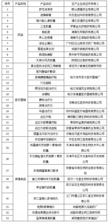 根据违法广告监测情况,总局稽查局从2014年度刊播严重违法广告且2015年第一季度仍继续刊播,并且次数较高的违法广告中,筛选出了违法情节严重的33个产品(10个药品、13个医疗器械和10个保健食品),涉及30家企业。