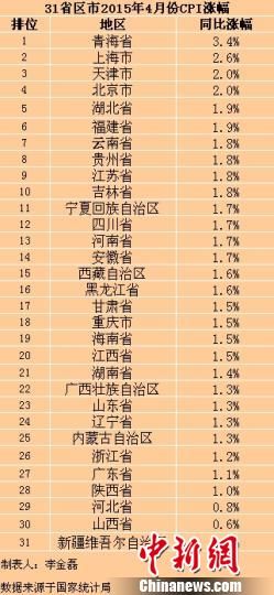 在这31个省份中,青海4月份cpi同比涨幅最高,为3.4%,也是全国仅有的cpi涨幅在“3”时代的地区。新疆涨幅最低,仅为0.2%。