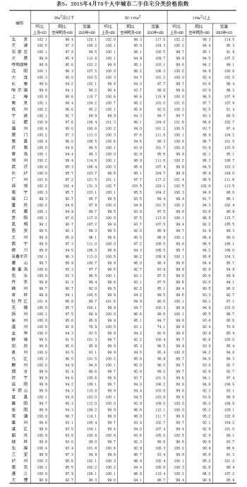 (一)与上月相比,70个大中城市中,价格下降的城市有48个,上涨的城市有18个,持平的城市有4个。环比价格变动中,最高涨幅为1.8%,最低为下降0.7%。 (二)与去年同月相比,70个大中城市中,价格下降的城市有69个,上涨的城市有1个。4月份,同比价格变动中,最高涨幅为0.7%,最低为下降10.3%。 二、二手住宅价格变动情况 (一)与上月相比,70个大中城市中,价格下降的城市有34个,上涨的城市有28个,持平的城市有8个。环比价格变动中,最高涨幅为2.4%,最低为下降1.0%。 (二)与去年同月相比,70个大中城市中,价格下降的城市有69个,上涨的城市有1个。4月份,同比价格变动中,最高涨幅为2.8%,最低为下降12.4%。