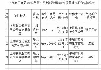 据悉,近期上海市工商局对该市部分超市、商场、综合交易市场销售的婴儿学步车、儿童推车、儿童三轮车、儿童自行车等5类39个批次童车进行了市场检查和质量抽检。经检测,有3个批次商品不合格,不合格率为7.7%。