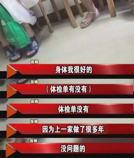 随后《民情观察室》记者又进入了另一家中介,当记者向老板提出对保姆健康有要求时,老板承诺,她这里的保姆都很健康。老板热情地为记者介绍了一位“熟练工”,然而当记者向保姆索要健康证明时却碰了壁。