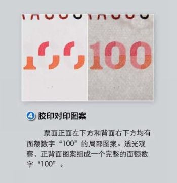 四看胶印对印图案。在钞票正面左下方和背面右下方,两面都有数字“100”的局部图案。透光观察,正背面图案就可以组成一个完整的面额数字“100”。