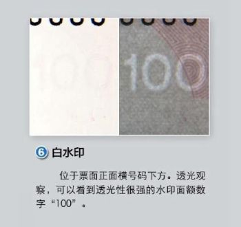 六看白水印。位于钞票正面横号码下方。透光观察,可以看到透光性很强的水印面额数字“100”。