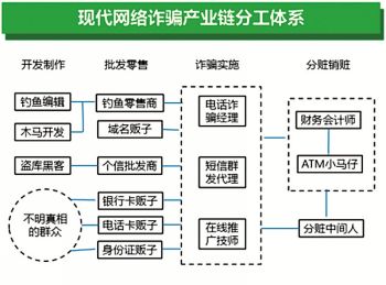 多工种协同作案有完整产业链 网络诈骗分为钓鱼编辑、木马开发、盗库黑客、钓鱼零售商、域名贩子、个信批发商、银行卡贩子、电话卡贩子、身份证贩子、电话诈骗经理、短信群发代理、在线推广技师、财务会计师、atm小马仔、分赃中间人等15种“工种”,在某些特殊情况下,还有其他“专业人士”加入其中。