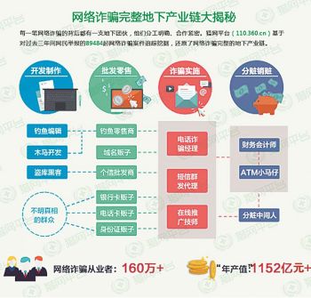 基于对网民举报的近9万起网络诈骗案件的追踪研究,猎网平台发现,网络诈骗已形成了一条完整的、分工明确的成熟的地下黑产业链,可划分多达15个工种。初步统计,网络诈骗从业者至少有160万人,“年产值”超过1100亿元,已成为继赌博和色情之后的中国第三大黑色产业。