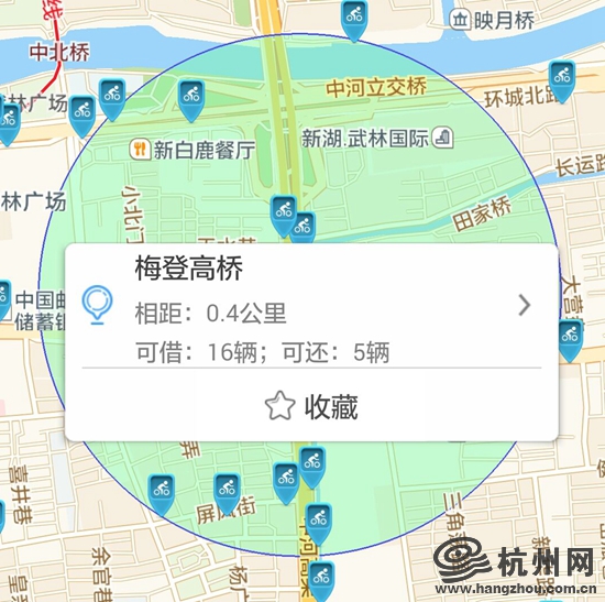 据了解,APP系统覆盖杭州市主城区所有公共自行车租赁点。晚上9:00记者站在中河路和体育场路交叉口,点击最近的水滴点,显示“梅登高桥租赁点”距离400米,可借16辆车,可还5辆车。