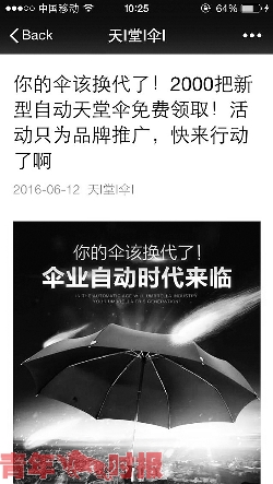 昨天上午10点不到,一则名为“你的伞该换代了!2000把新型自动天堂伞免费领取……”的图文消息在微信群里炸开了窝。魏先生带着疑惑打进时报热线,请求帮助问问此事真假。记者联系上了杭州市天堂伞业集团有限公司办公室的何主任,证实此事为个人恶意所为,消费者切勿上当受骗!