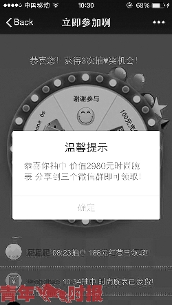 上午10点22分,记者关注了“天丨堂丨伞”,马上跳出几行字“感谢您的支持,本次活动不收取任何费用!参加活动请回复数字1”。记者按照要求回复了“1”后,跳出“免费参与方法”:点击所给的链接,出现一个抽奖转盘,上有苹果手机、时尚腕表、红包和充值卡等,点进去,系统会提示你有3次抽奖机会,前2次记者都没抽中,第3次抽到一个“价值2980元时尚腕表”,对方提示分享到3个微信群即可领取,把这个抽奖转盘的链接发到朋友圈,并截图发回公众号后 台,第一步就算完成了。第二步,要将“新型自动天堂伞免费领取”的微信转发到3个朋友圈并截图发回。所有的要求完成后,会有信息告诉你,“工作人员审核无误后,两天内联系您发货”。 看上去,一切都很像“只是为了品牌推广”这个说法。