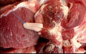 图1.猪肉中的“白色带状物”(佘锐萍)
