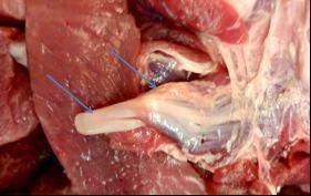 同时,为了进一步弄清此问题,佘锐萍教授专门到某超市猪肉销售柜台去寻找到了类似网上的白色带状物(见下图1),此物用手拉的时候可变长,放开 后,它可渐渐缩回变短。用刀切开此白色带状物后部表面的肌肉后,展现在眼前的是一块肌肉结构(图2),而白色带状物正是这块肌肉的肌腱结构,并不是寄生 虫。进一步翻开后发现,这块肉是从猪蹄部分割下来的一块肌肉。