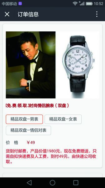 随后,法晚记者按照王小姐的链接尝试了一下,发现这个红包链接里附有多条广告,此外,在转发后还有个免费抽奖环节,记者幸运地“抽中”了价值1980元的手表,不过需要记者支付49元的快递费。