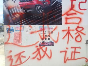 车主在广告牌上喷涂“还我合格证”。张文章摄