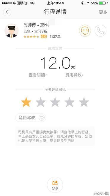 今日,赵女士反映称,早上通过滴滴打车软件为12岁的女儿单独叫车,前往位于中关村的培训机构上课。赵女士通过订单查询发现,本应只要10元的打车行程,已经跳至30多元。拨通司机电话后,发现无人接听,赵女士通过女儿手机联系上司机,“他说话吞吞吐吐的,感觉有点慌张,说自己不清楚在哪,再三追问下他说到了北京西站,说把孩子送回去。”记者查询地图发现,赵女士叫车的目的地位于出发地的北方4公里处,司机实际到达的北京西站位于出发地的南侧10公里处。司机告诉京华时报记者,线路出现问题为导航故障所致。“这不是绕路,路线完全南辕北辙,我怀疑他拐卖儿童”,回想起来赵女士仍心有余悸。今日上午,赵女士已报警处理。滴滴方面称,已经暂时封禁司机帐号,如乘客寻求警方介入,滴滴可全力配合警方调查。 |