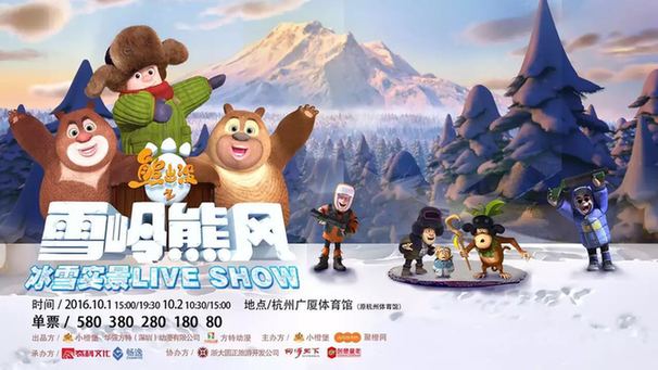 2016年国庆节,杭州4场《熊出没之雪岭熊风》冰雪实景Live Show将登陆杭州,开启盛大冰雪party:场场不容错过,感人故事、超炫舞美、震撼现场,值得观众走进现场观看甚至反复体验。2016让与熊大熊二的冒险旅程走进千家万户,给孩子们带来无尽的欢乐。