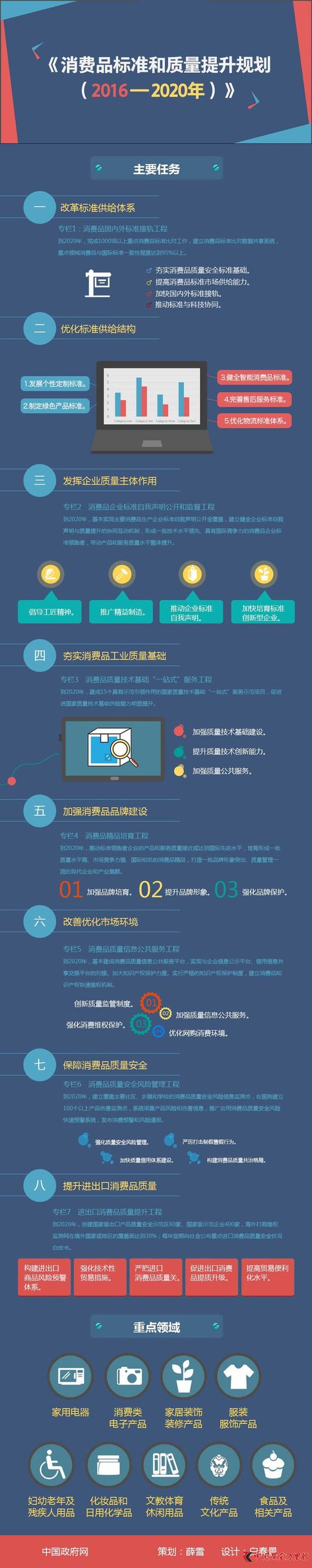 《规划》提出:一是改革标准供给体系,构建政府主导制定标准与市场自主制定标准协同发展、协调配套的新型标准体系。加快国内外标准接轨,重点领域的主要消费品与国际标准一致性程度达到95%以上,推动实现内外销产品“同线同标同质”。二是优化标准供给结构,满足消费结构升级的需求。加快推动个性定制、绿色产品、智能产品、售后服务、物流配送等新兴产品和新兴业态标准化发展。三是发挥企业质量主体作用,激发企业质量提升内生动力。推动第三方发布企业标准“排行榜”,建立企业标准“领跑者”制度。四是夯实消费品工业质量基础,提升质量技术创新能力。实施消费品质量技术基础“一站式”服务工程,形成全链条的“标准-计量-认证认可-检验检测”解决方案。五是加强消费品品牌建设,提高中国消费品知名度和美誉度,消费品质量竞争力指数稳定在84以上。六是改善优化市场环境,进一步激发市场活力和消费潜力。建立消费品生产经营负面清单管理制度,除强制性标准和法律法规明确规定外,取消消费品生产经营其他市场准入限制。七是创新消费品质量安全监管模式,保障消费品质量安全。实行“随机抽查企业、随机抽检产品、随机选择检测机构”制度,规定对产品质量国家监督抽查合格的同一企业的同一规格型号产品,6个月内任何地方、部门和机构不得重复抽查,消费品质量国家监督抽查合格率稳定在90%以上。八是实施外贸“优进优出”战略,提升进出口消费品质量。