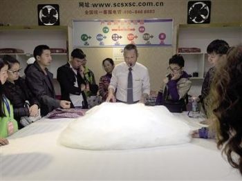 下午2点半,按照行程,旅行团将参观蜀绣,旅行团被带往一家门口写有“蜀绣蜀锦科技文化展示中心”字样的单位,但这家单位实际上是名为“依格尔”的床上用品直销工厂。讲解员简单讲解了有关蜀绣蜀锦的知识后,就把游客带往一个展览厅,向游客推介他们工厂的蚕丝床上用品,价格从3980到6980元不等。