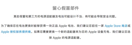 苹果官网称,某些假冒和第三方的电源适配器及电池可能设计不当,有可能会导致安全问题。