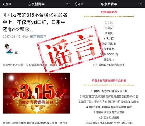 然而,这样涉嫌造谣的行为并非个案。据多家在天猫上开设旗舰店的美妆品牌反馈,就在2017年315消费者权益保护日当天,号称“日本华人第一媒体”的“东京新青年”假借国家质检总局名义,发布《刚刚发布的315不合格化妆品名单上,不仅有ysl口红,日系中还有sk2和它…》一文。此时,据“东京新青年”向POLA品牌及天猫消费者道歉才过了两天。