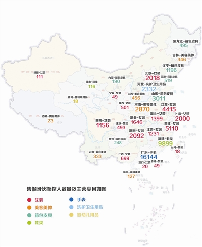 据阿里巴巴《售假账户操控人地图》显示,通过数据挖掘到18万家因售假被关闭的淘宝店铺背后的疑似控制人团伙 61330个,分布在全国不同地方,主要集中在东部沿海地区,广东、福建、浙江、江苏、山东是数量最多的五个省份,占比63%。其中16144个疑似售假团伙操控人在广东,占了1/4还多。