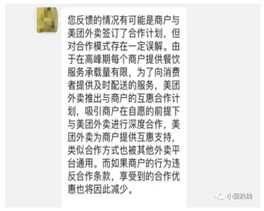 据苏先生介绍,他们一直和饿了么、美团 两个外卖商家合作,做外卖赚钱。不过前段时间,就有一位美团的业务经理罗先生,找到苏先生,说要签独家合作的战略合同,为他提供降佣金、扩范围等扶持措施。 听上去优惠多多,不过苏先生想到一家平台生意不多,根本不够开销,希望继续和两家合作,于是就婉拒了独家合作的要求。没想到的是,对方放话要缩小他的配送范围!