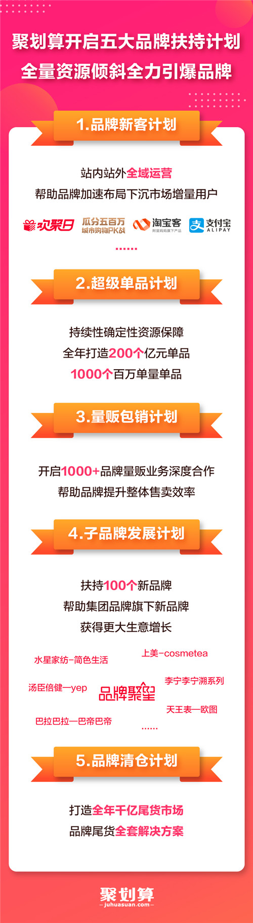 图/聚划算手淘入口位置进一步加强,品牌扶持计划就是新聚划算带来的新机会 五大品牌扶持计划,切中品牌五大需求,定位十分明确。 品牌新客计划旨在帮助品牌获取下沉市场增量用户。聚划算将整合淘系内资源,联动阿里妈妈淘宝联盟、支付宝每日必抢,帮助品牌实现站内站外的全域运营和性价比人群的全面覆盖。同时通过城市欢聚日、城市购物PK战等聚划算城市战略,对三四线城市用户进行精准触达。数据显示,2018年参加聚划算的品牌,平均有80%的成交来自新购买用户,而新购买用户中的近一半都来自下沉市场。今年这一数字将继续提升。 超级单品计划旨在发挥聚划算的规模化爆发优势,帮助品牌打造主力爆款,并通过持续性确定性的资源保障,完成品牌核心货品的全年生意布局,年内计划打造200个亿元单品,1000个百万单量单品。 量贩包销计划主要针对大快消行业,年内将开启1000+品牌量贩业务深度合作,以大包装量贩式的售卖方式,为中国家庭用户提供最佳选择,帮助品牌提高客单价和整体售卖效率。 子品牌发展计划,旨在集合淘系生态力量,帮助集团性品牌发展新系列品牌,打开新消费市场。目前,承载该计划的聚划算“品牌聚星”项目,已与李宁溯系列、百丽旗下“15分钟”、巴拉巴拉旗下“巴帝巴帝”童装、水星家纺旗下“简色生活”、 汤臣倍健旗下“Yep”、 ISDIN新系列等36家国内国际品牌达成合作。年内计划扶持100个新品牌。 品牌清仓计划,将通过独立清仓频道、淘客专属阵地以及周末吾折天等营销IP,为品牌提供最高效的线上尾货解决方案,打造全年千亿尾货市场。其中周末吾折天上线仅一个月,销售规模就已翻番。 此外,聚划算还将在用户端重点打造一系列核心营销IP,涵盖品牌爆发、品牌成长、品类延展、新客获取等各个纬度。如刚刚上线的“淘宝吃货”品牌,就为食品商家发力吃货人群提供了全新阵地。 3月21日,淘宝总裁、天猫总裁蒋凡为聚划算定下新使命——在对品质惠经济的追求下,升级供给侧,满足新需求,同时为商家创造巨大新机会。聚划算现场宣布,要孵化1000个全球产业带,引爆30000个品牌。短短一个月,已有数千品牌在聚划算得到销量和用户的爆发。 |