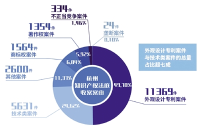 报告显示,8年来,法庭累计审结各类知识产权案件2.4万余件,包含多起具有国内外影响力的“首例”案件。从案由来看,外观设计专利案件数量最多,占比49.70%;技术类案件(包括发明专利、实用新型专利、植物新品种、集成电路布图设计、技术秘密、计算机软件的权属等案件)数量次之,占比24.62%;其余则为不正当竞争案件、商标权案件、垄断案件等。
