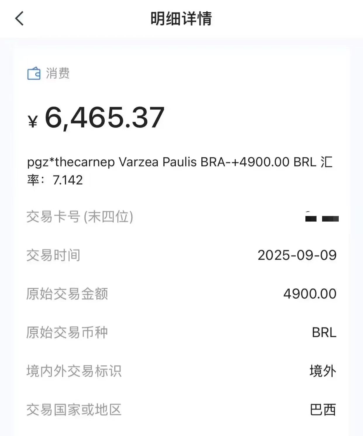 中国消费者报报道(记者聂国春)人在家中坐,账单巴西来。9月9日至11日凌晨,多位浦发银行万事达无价世界信用卡(卡友俗称“红沙宣”)持卡人在社交平台上反映,遭遇境外盗刷。这些盗刷交易均发生在巴西,单笔金额从数千元至数万元不等。
