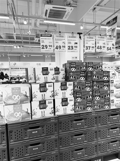 作为一家自营超市,自营产品在这家超市中的占比也非常高,在乳品、熟食、百货、休闲食品、米面等品类上,都可以看见美团自营品牌的身影。超市在装修风格上也完全遵循着硬折扣超市的风格:极简、一眼到底,一进门就可以将店内不同品类的商品摆放位置看个七七八八,比起超市,更像一个升级版的菜市场。