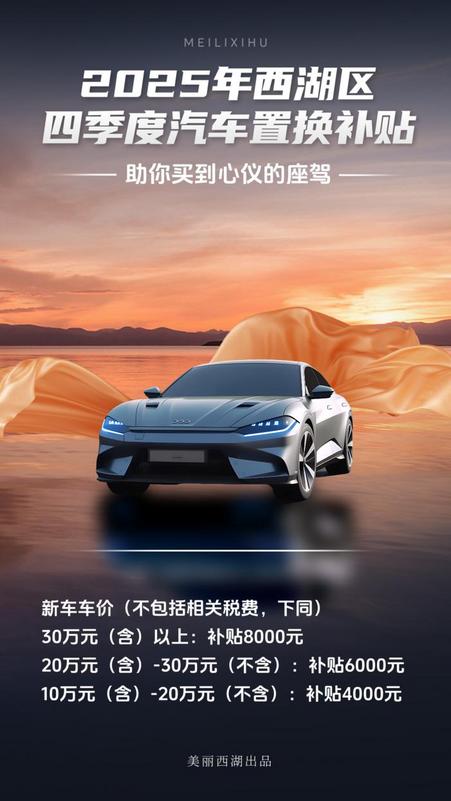 在汽车消费领域,西湖区的汽车置换补贴政策颇受关注。对个人消费者转让(变更除外),2025年11月1日前登记在本人名下乘用车,并在西湖区相关汽车经销企业购买7座(含)以下乘用车的,根据新车价格分档给予一次性定额补贴,先到先得,兑完即止。新车车价在30万元以上的补贴8000元,在20万元-30万元的补贴6000元;在10万元-20万元的补贴4000元。