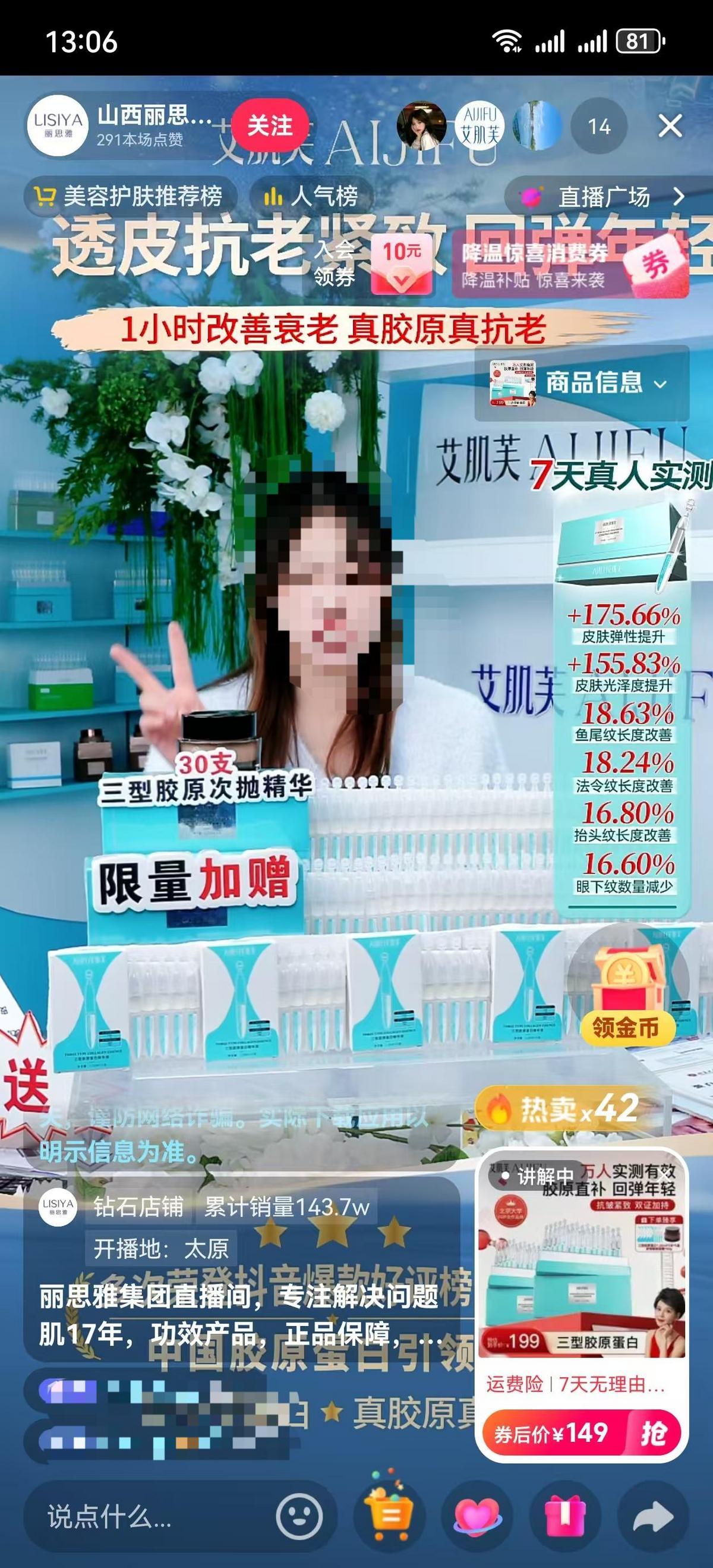 11月30日13时许,记者在某直播平台上的“山西丽思雅生物科技集团有限公司企业店”直播间看到,主播正在介绍“艾肌芙三型胶原蛋白次抛精华液”,称“7天能够做到抗皱紧致”。在回复观众提问时,该主播称“我们就是艾肌肤,和(艾肌芙)旗舰店是一家店”。记者看到,该直播间画面和上述“AIJIFU艾肌芙官方旗舰店”的直播画面相似,画面最上方有较大字体标注“透皮抗老紧致 回弹年轻”,紧挨着的是红字“1小时改善衰老 真胶原真抗老”。