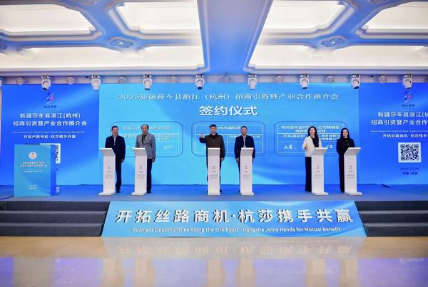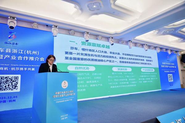 2025年12月5日莎车县政府在浙江杭州市成功举办以“开拓丝路商机 杭莎携手共赢”为主题的招商引资暨产业合作推介会,来自浙江各商协会的220多名企业家参加了会议。